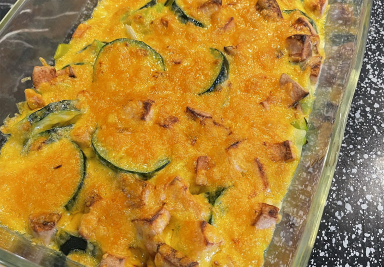 Keto: Zucchini-Lauch-Auflauf mit Käse überbacken