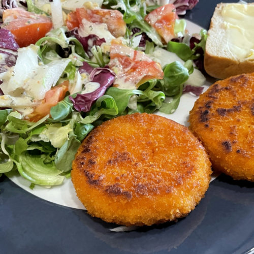 Die Camembert Taler in einer Pfanne mit etwas Butterschmalz oder knusprig backen. Ca. 3-4 Minuten pro Seite unter mehrmaligem Wenden.
