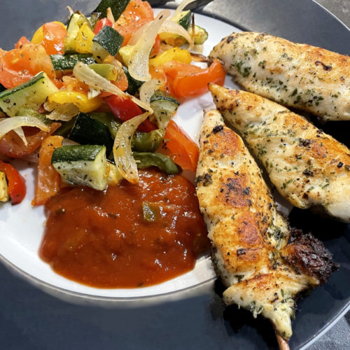 Richten Sie die Hähnchenspieße, das Ofengemüse und die Salsa Soße auf einem Teller an.